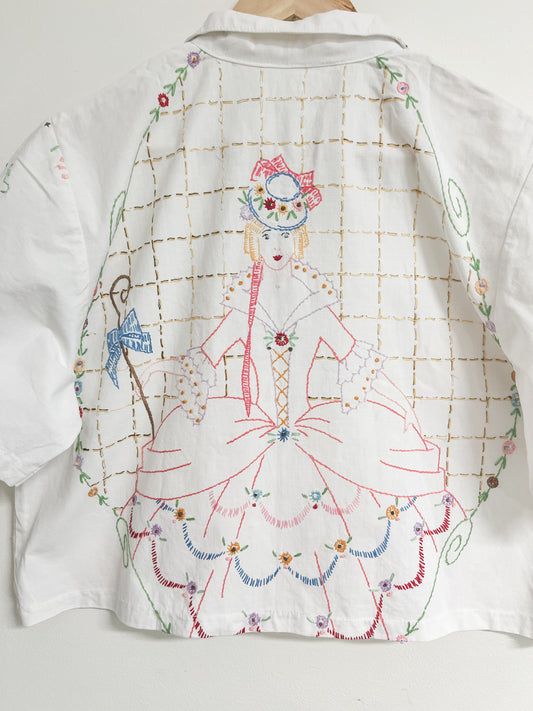 Designed and created from vintage embroidered tablecloths and linens.